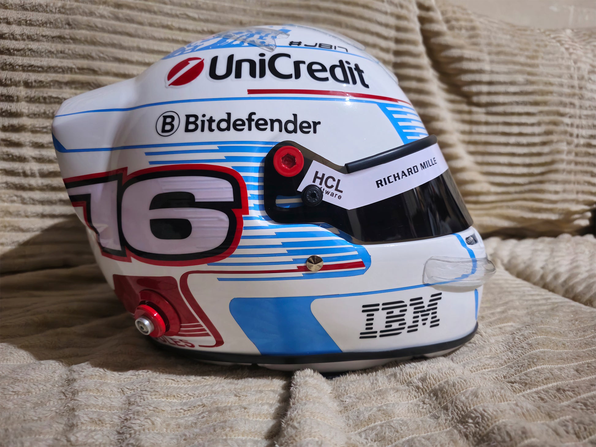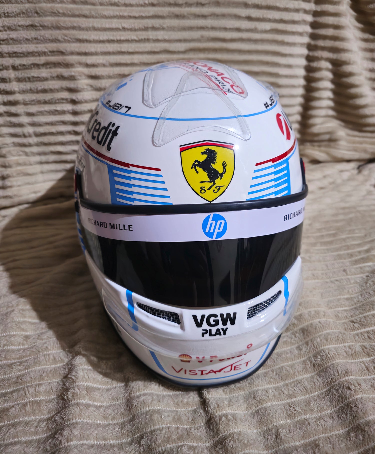 Este casco es una réplica exacta del casco usado por CHARLES LECLERC en la temporada 2025 en MÓNACO.